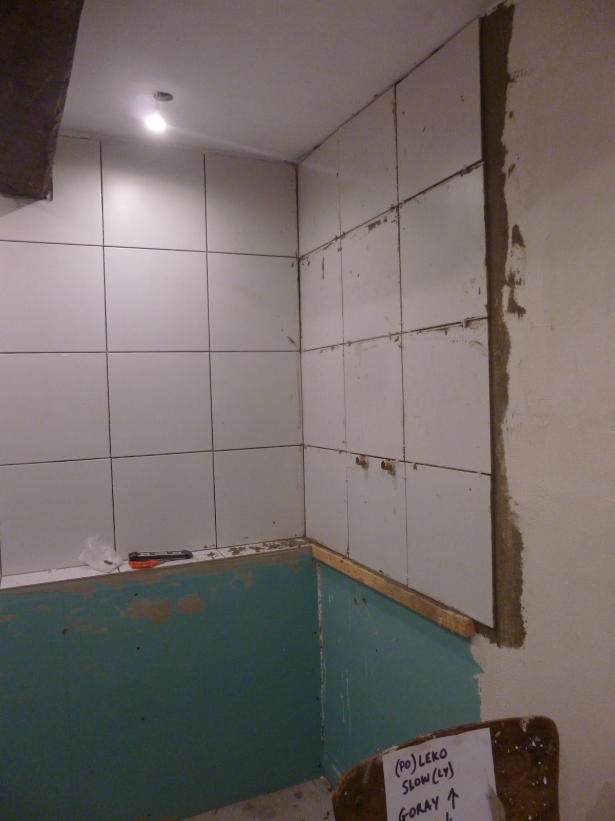 Anyway we carried on and after doing the shelf it was easy and surprisingly we got the whole top half of the back wall done and started on one side - which is alot more than we expected. This is great - actually looking like a bathroom now!! :D After letting it go off for a bit we went back in to clean off the excess adhesive and that was more than enough work for the day.